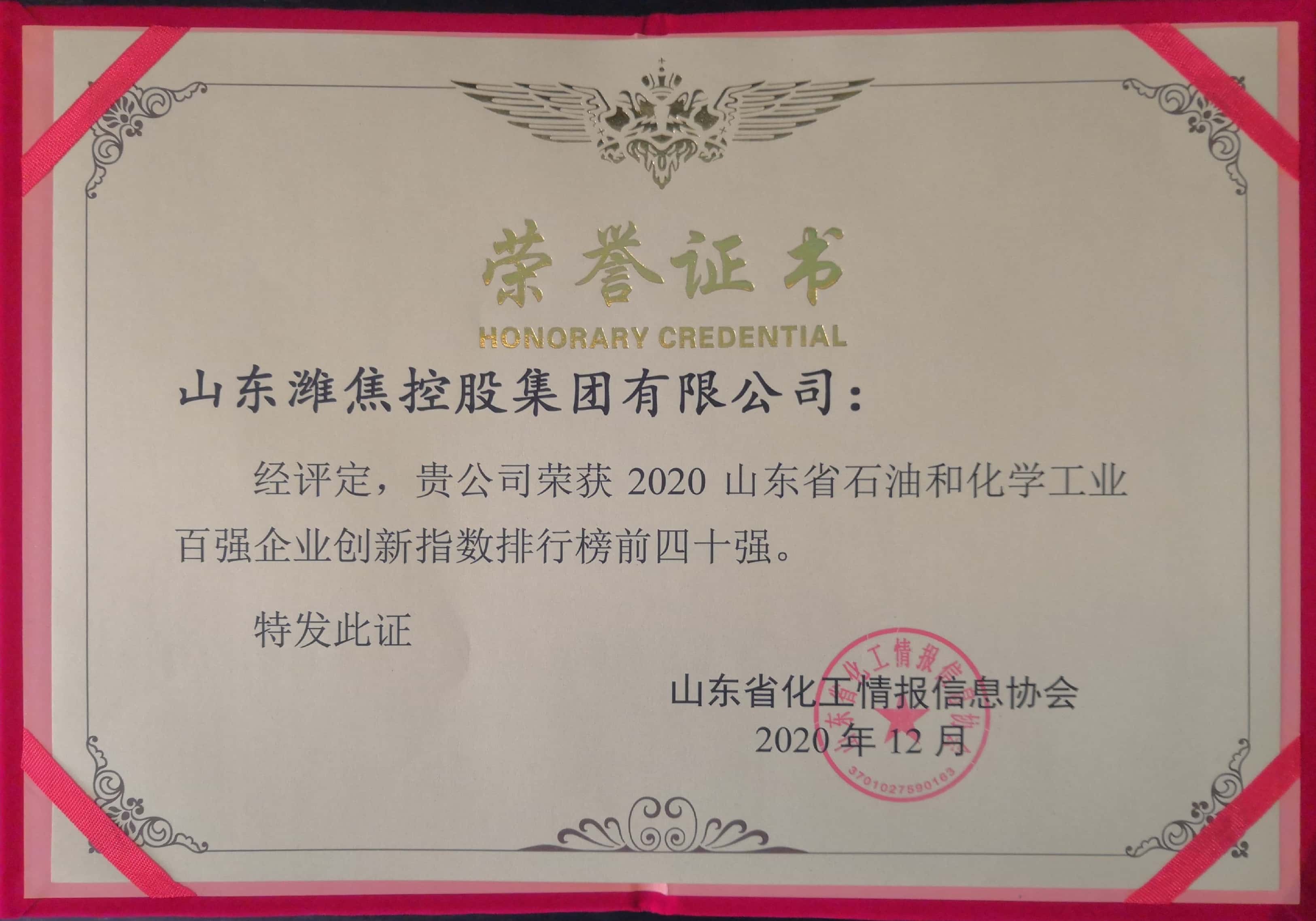 12月16日至17日,由山東省化工情報(bào)信息協(xié)會(huì)主辦的2020(第十屆)中國化工產(chǎn)學(xué)研高峰論壇在東營廣饒召開。會(huì)上,集團(tuán)公司榮獲“2020山東省石油和化學(xué)工業(yè)100強(qiáng)企業(yè)”稱號,并在百強(qiáng)企業(yè)創(chuàng)新指數(shù)排行榜位列35位。