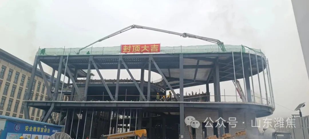 11月16日,伴隨著一車混凝土澆筑的完成,濰焦文化中 心項目經過72天爭分奪秒日夜奮戰(zhàn),主體架構順利封頂。